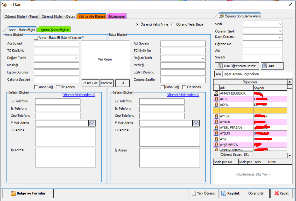 Kurs-Dershane Programı Veli Bilgileri Ekranı