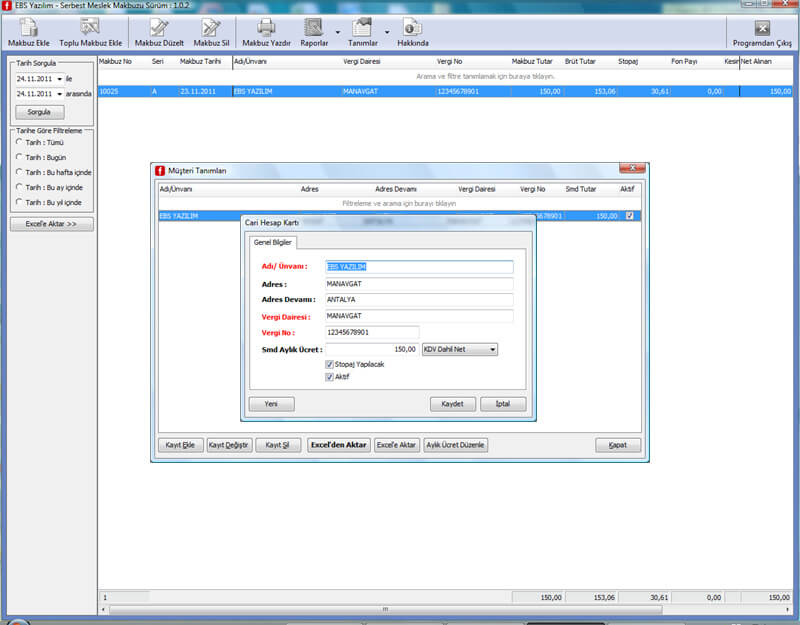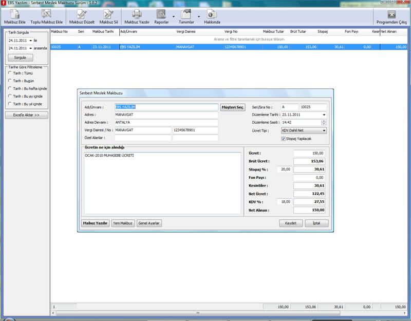 Serbest meslek mükelleflerinin kazanç defterlerini ve makbuzlarını kolaylıkla oluşturup, takip edebilecekleri bir program.