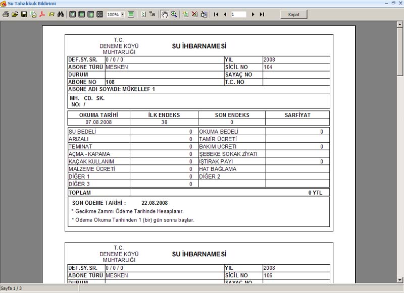 Tekli veya çoklu su harcama bildirimi hazırlayabilir, tek bir tıklama ile borçlu abonelerinizi listeleyebilir veya yazdırabilirsiniz.